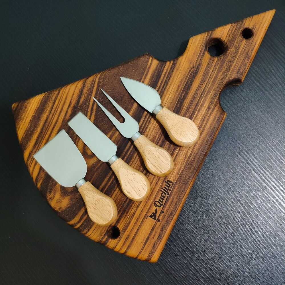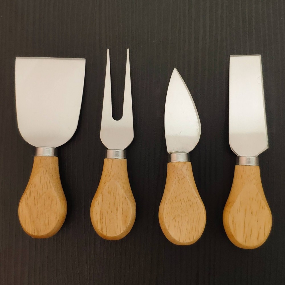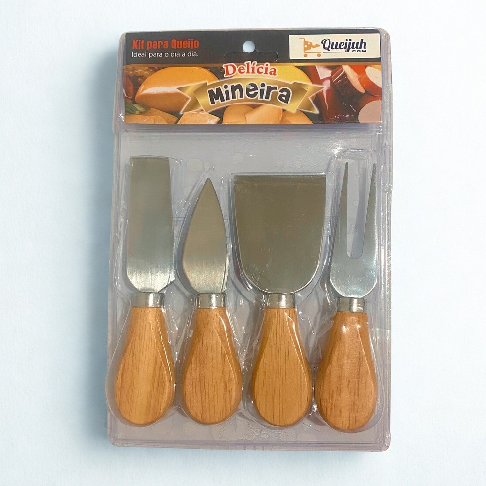 A espátula mais larga, serve para queijos mais macios com estrutura, ex: gorgonzola; A faca retangular, serve para queijos cremosos, ex: brie, camembert; A faca tipo "gota dágua" serve para queijos duros, ex: parmesão, grana padano canastra curado. E também temos o garfo para queijos que é usado para auxiliar no corte.